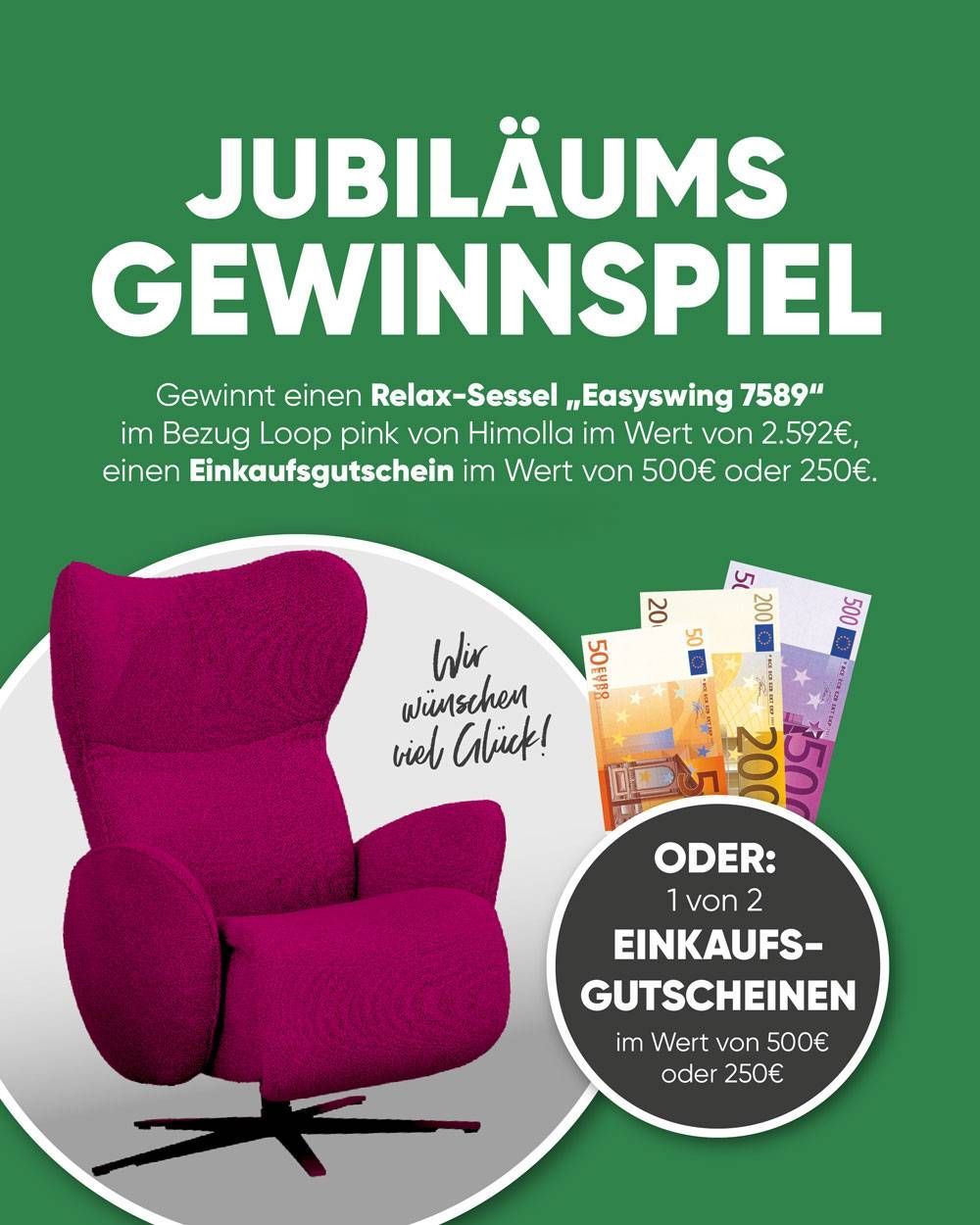 Gewinnspielzeitraum bis 30.9.26 Teilnahmeberechtigt sind alle volljährigen und geschäftsfähigen Personen, die ihre Daten persönlich während des Spiels angeben. Jeder Kunde darf nur einmal teilnehmen. Die Teilnahme ist nicht an einen Kauf gebunden. Die Gewinner werden nach dem Teilnahmeschluss gezogen. Teilnahmeschluss ist der 30.9.26 um 23:59 Uhr. Teilnahmen, die nach dem Teilnahmeschluss eingehen, werden nicht mehr berücksichtigt. Die Gewinner erhalten eine schriftliche Benachrichtigung. Die Auslosung findet am 2.10.26 im Möbelhaus statt. Der Gewinn verfällt, wenn ein Teilnehmer nicht innerhalb von 14 Tagen auf die Gewinnbenachrichtigung reagiert oder falsche Angaben gemacht hat und eine Einlösung des Preises nicht möglich ist. Der Veranstalter behält sich vor, in diesem Fall einen neuen Gewinner auszulosen. Keine Barauszahlung des Gewinns möglich. Der Rechtsweg ist ausgeschlossen. Von der Teilnahme ausgeschlossen sind: Mitarbeiter der Möbel Hensel GmbH und deren Angehörige sowie Mitarbeiter kooperierender Unternehmen, die an der Aktion teilnehmen, und deren Angehörige. Die Teilnahmedaten werden zur Abwicklung des Gewinnspiels gemäß Art. 6 Abs. 1 Buchst. b DSGVO verwendet, nicht an Dritte weitergegeben und unverzüglich nach Beendigung des Gewinnspiels gelöscht. Durch die Teilnahme am Gewinnspiel bestätigen die Teilnehmer, dass sie sich mit diesen Teilnahmebedingungen einverstanden erklären. Der Preis wird dem Gewinner in Hause Möbel Hensel, Johanniskirchstraße 14-20, 45329 Essen nach vorheriger Terminabsprache übergeben.